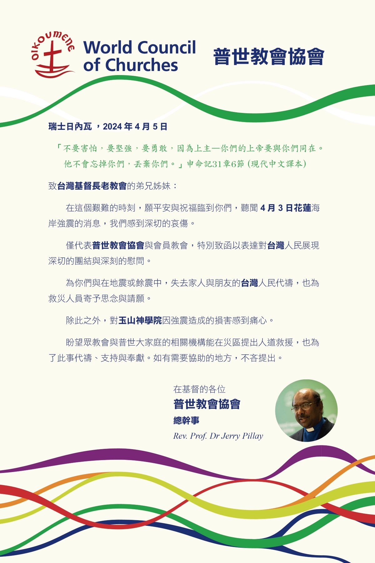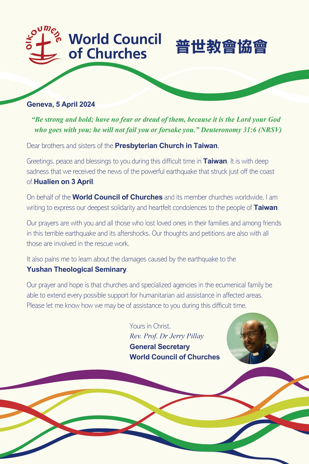 On behalf of the World Council of Churches and its member churches worldwide, I am writing to express our deepest solidarity and heartfelt condolences to the people of Taiwan.